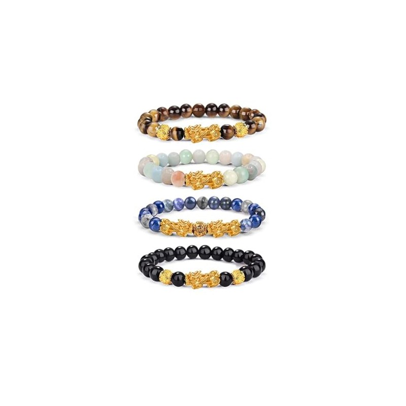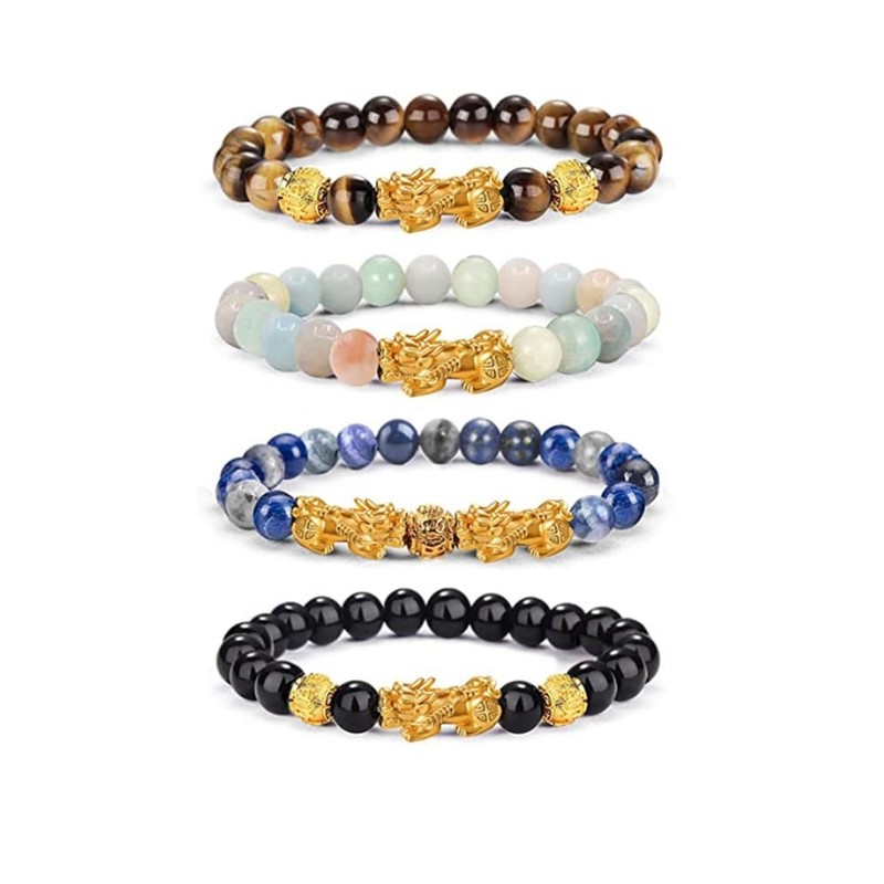 Pixiu Green Jade Natural Stone Change Color Elastic&Braided String Rope Bracelet Brave Troops Lucky Wealth Bracelet for Women Men Gift-4PCS B