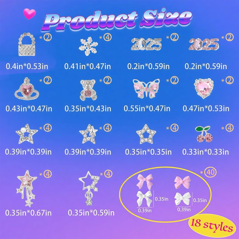 - Unique and Versatile Design ElementsOur Luxurious Nail Art Set boasts an array of unique and versatile design elements, from charming butterflies and bears to stylish purses adorned with '2025', ensuring you can create a manicure that perfectly matches your personality and style.