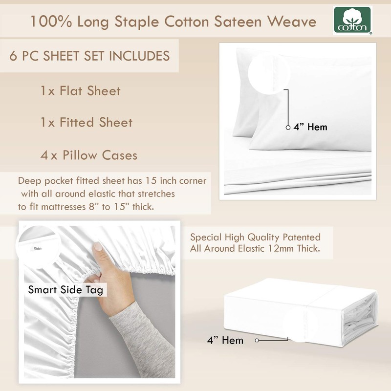 Pizuna 400 Thread Count White 6 Piece Queen Bed Sheets Set Includes 2 Extra Pillow Cases, 100% Long Staple Cotton Soft Sateen deep Pocket Queen Sheet Sets. Value Pack 6 pc Sheets for Queen Size Bed