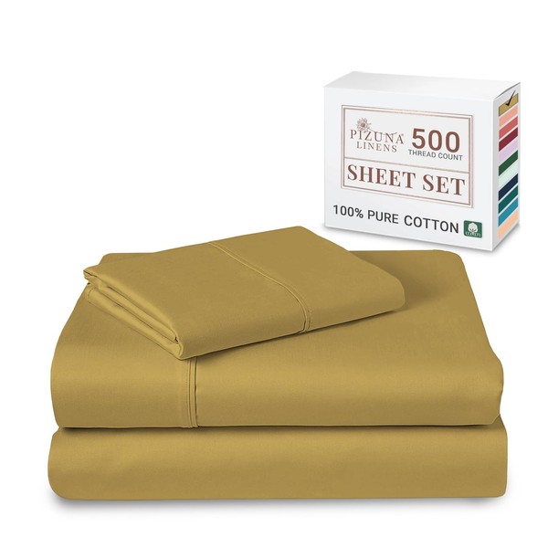 Pizuna Cotton Single Sheet Set, 500 Thread Count 100% Combed Cotton Sateen Weave Single Bed Sheet Set Include 1 Fitted Sheet, 1 Flat Sheet & 1 Pillow Case (Mustard Gold Sheet Set - 3 PC)