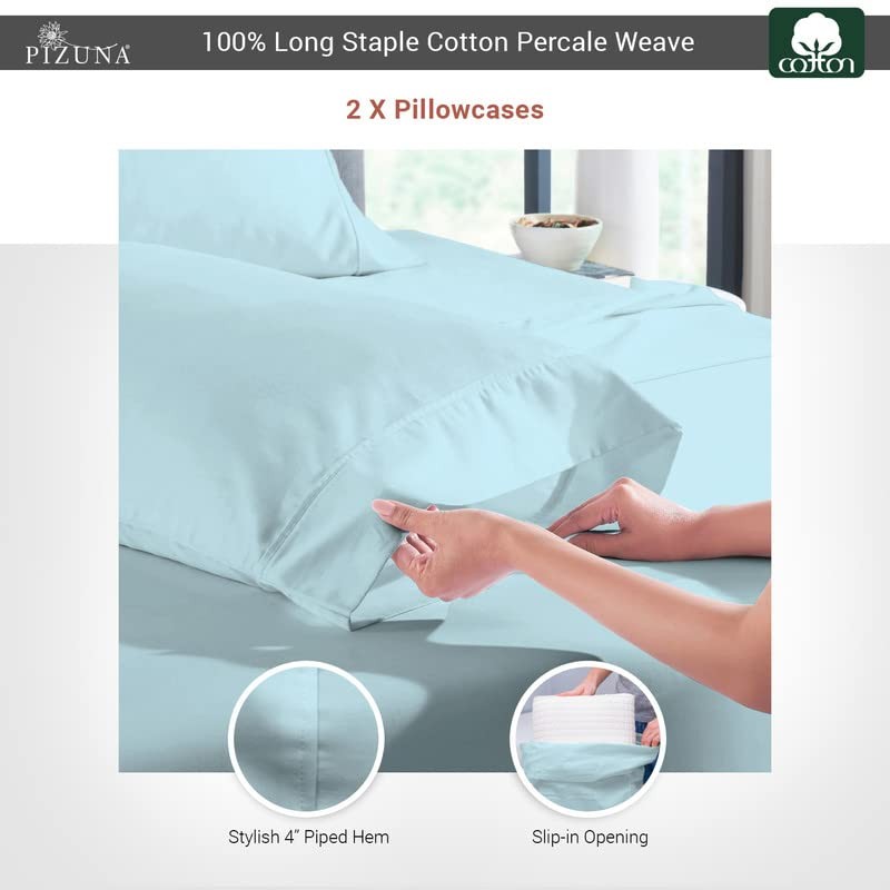 Pizuna Percale Cotton Pillow Cases King Size Set of 2 Baby Blue, 100% Long Staple Cotton Crisp Percale Weave with Stylish 4 inch Hem (Combed Baby Blue Cotton Pillow Cases King)