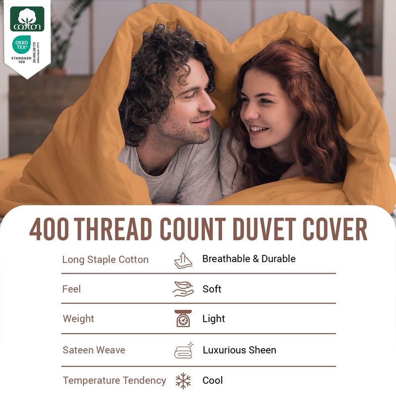 - Cool, Breathable & Smooth: Crafted from 100% Long-Staple Combed Cotton Sateen Weave, this 400 Thread Count duvet cover queen size with it's lighweight texture is made with specially compacted yarn. Minimal artificial processing makes this queen duvet cover gentle on all skin types, prevents night sweats, absorbs moisture and regulates body temperature to sleep cool while maintaining the elegant hotel look.
