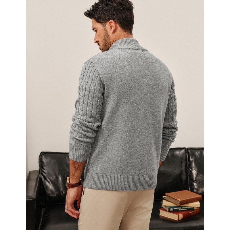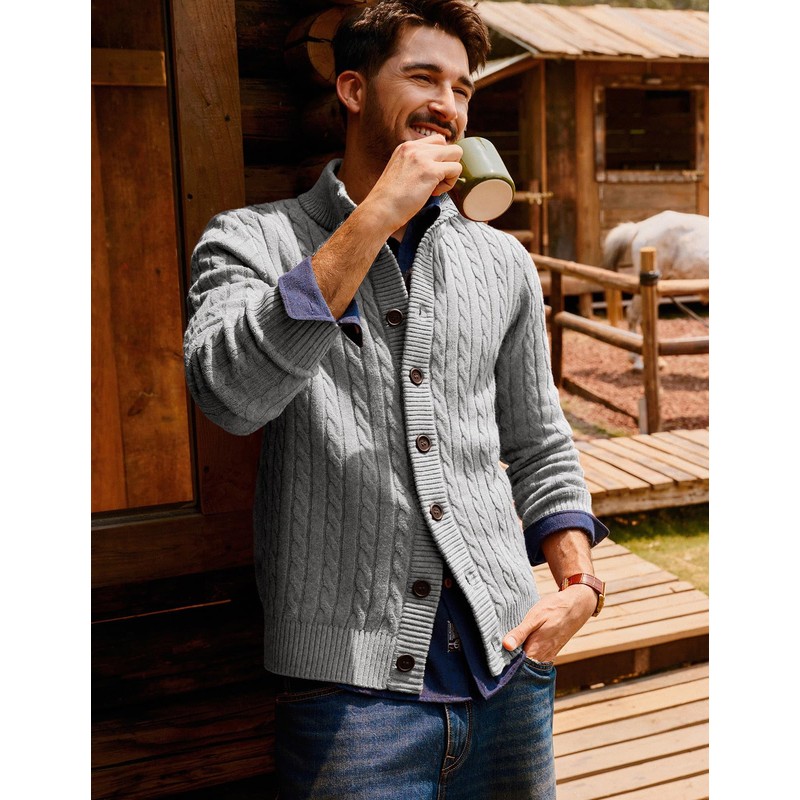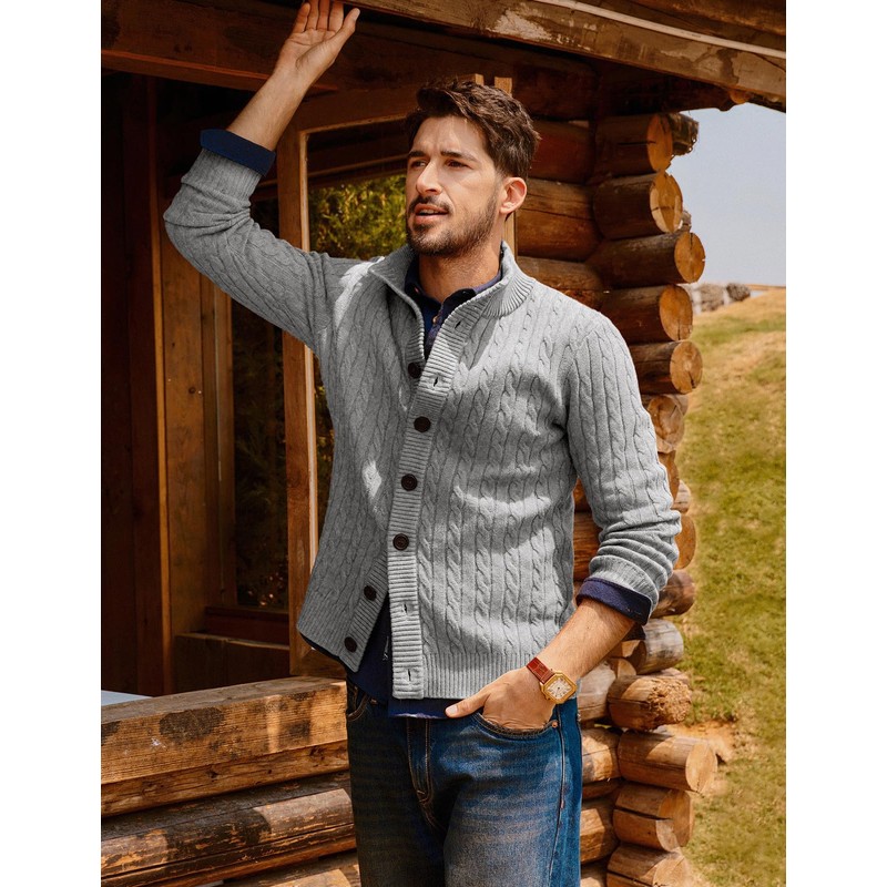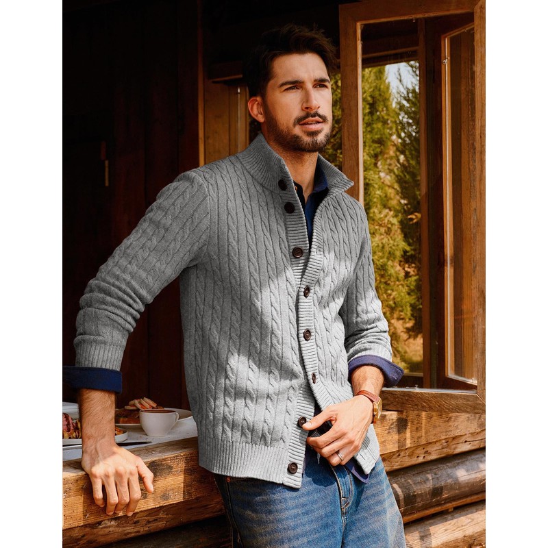 Classic stand collar men's cardigan featuring twisted cable patterns and an 8-button placket, finished with ribbed cuffs and hem for a clean, minimalist look. Made from warm, stretchy, and breathable fabric for lightweight comfort and ease of movement. Perfect for offices, events, or casual outings—easily layered over tees or under coats. An ideal gift for any occasion, offering timeless style and everyday versatility.