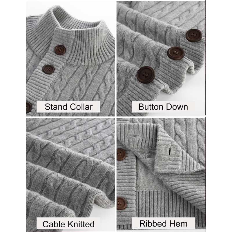 • Men Cardigan: Classic stand collar with twisted cable patterns, 8-button placket closure, and ribbed cuffs and hem. Solid-color minimalist design for timeless elegance