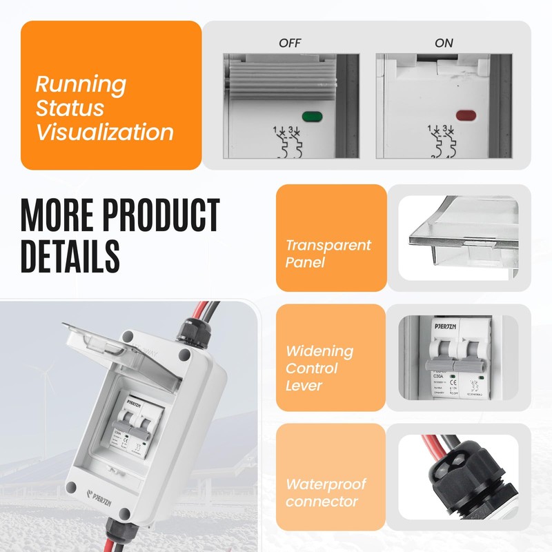 - 𝐏𝐫𝐞𝐦𝐢𝐮𝐦 𝐐𝐮𝐚𝐥𝐢𝐭𝐲: .Pjerjzn solar panel disconnector switch are newly upgraded with connectors that do not differentiate between male and female wires for quick installation. Made of premium quality material, thickened purple copper coil, wider operating handle, Transparent cover for easy checking of operational status, waterproof sealing silicone ring, IP65 waterproof and dustproof.