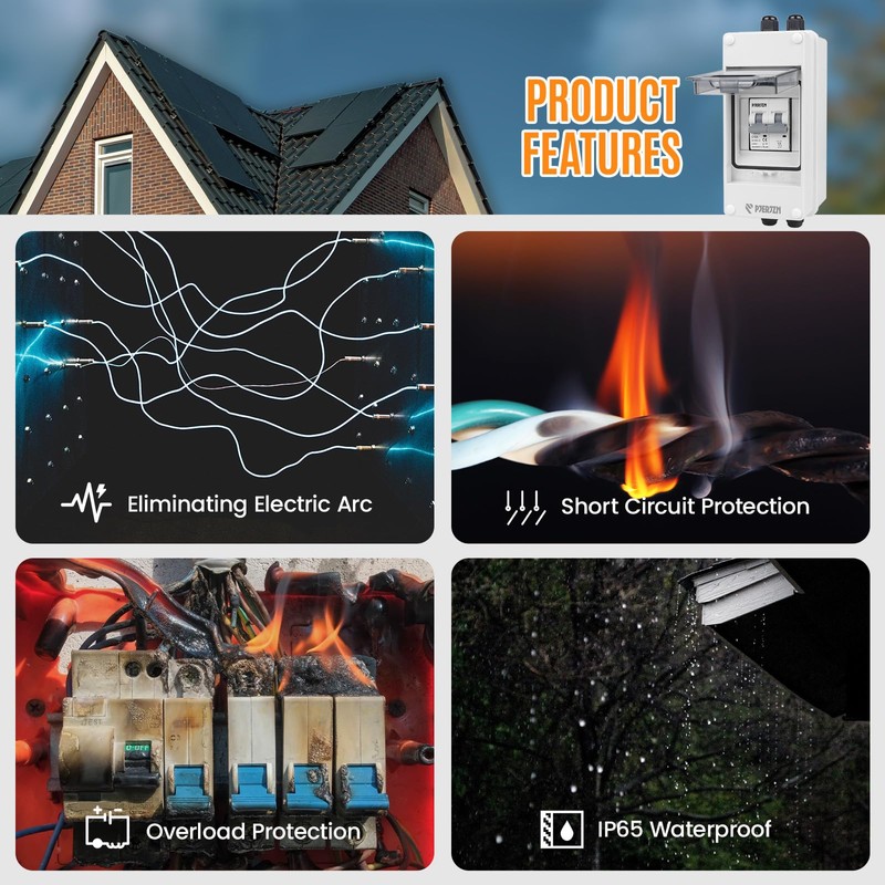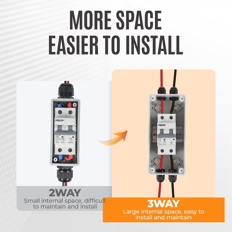 - 𝐄𝐚𝐬𝐲 𝐈𝐧𝐬𝐭𝐚𝐥𝐥𝐚𝐭𝐢𝐨𝐧: Solar dc disconnect, installed between solar panel and solar inverter, can realize faster and safer installation, plug and play. Circuit breaker is easy and convenient to assemble and disassemble, easily connected by two waterproof connectors on the top and bottom, with pre-drilled holes on the back and internal 35mm guide rails.