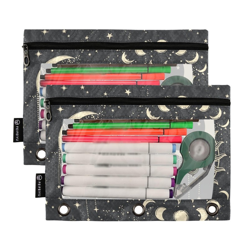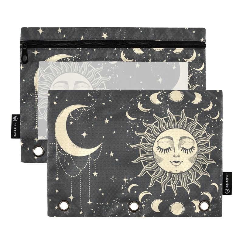 PJGINUIUA Tarot Sun Moon Goth Binder Pouch Zippered Pencil Pouches for 3 Ring Binder, 2 Pack Binder Pockets 3 Holes Pencil Case Bags with Clear Window