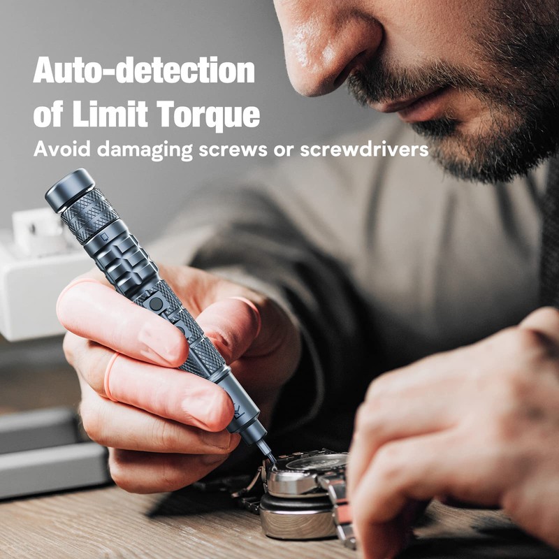- [360° Palmar Bracket & F/R Switch] The electric precision screwdriver is designed with the unique palmar bracket on the top that can be rotated 360° flexibly, letting you feel the best grip for you, and easily switch between manual and electric mode. When the screw is very tight, it can be loosened manually (torque: 2N.m). The forward and reverse buttons of the screwdriver electric make you quickly tighten or loosen screws, ideal for precision object disassembly and repair.