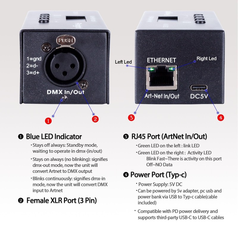 - One Universe: 1x DMX512 Out (3pin) with Art-Net, control up to 512 channels.
