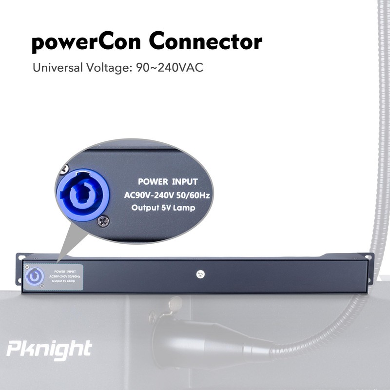 - Powercon Solution: Equipped with a Powercon connector and a grounded power cable, operating within a wide voltage range of 90~240VAC for the unit and 5VDC for the gooseneck lamps.