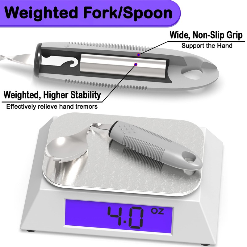 - Weighted 2 in 1 Fork/Spoon – 4.0 OZ. Parkinson spoon for hand tremors weight more than traditional parkinsons spoon set. Weighted spoons for tremors effectively relieve tremors to support those with hand tremors arthritis stroke seniors. 2 in 1 function makes it easy to eat noodles, salads and soups with one hand.