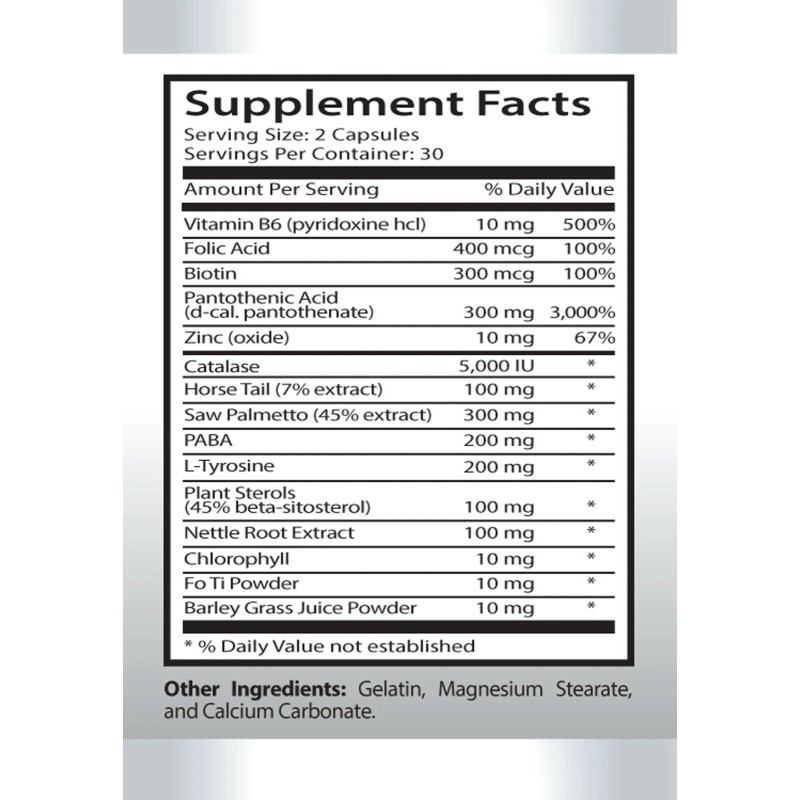 - Ingredients: Biotin, Pantothenic Acid, Catalase Complex, Horsetail Aerial Parts, Saw Palmetto Berries, PABA, L-Tyrosine