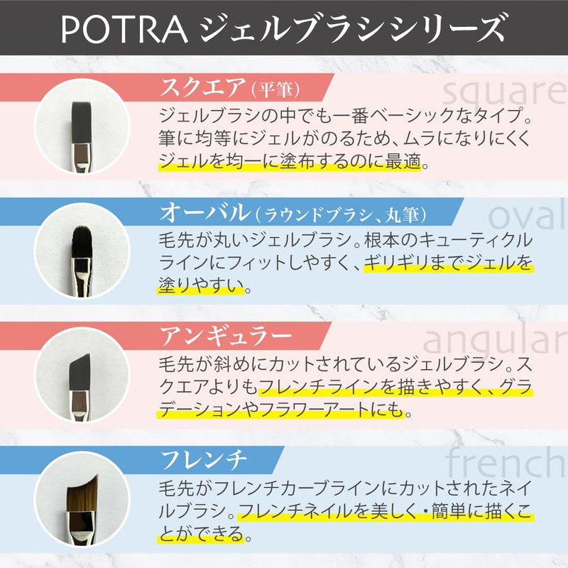 - (Angular Brush) Gel brush with beveled edges. It is easier to draw French lines than squares, and is recommended for gradations and flower art