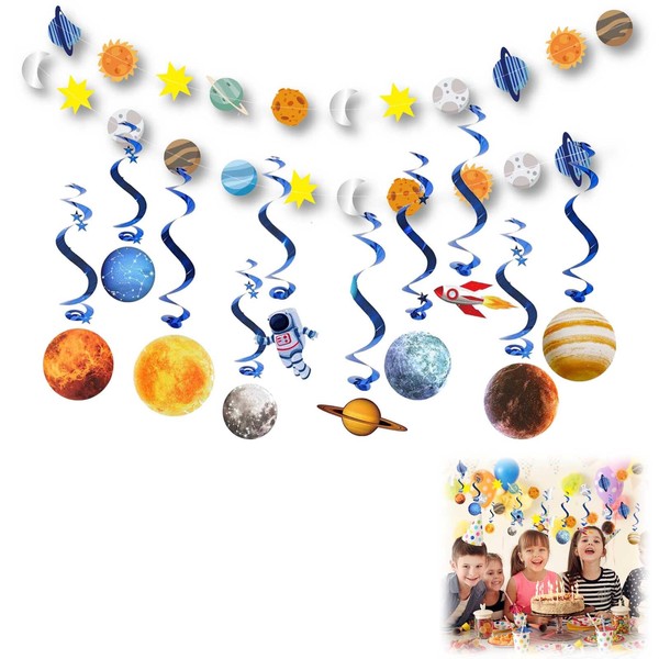 Planet Decoration Set - Space Party Decoration - 10 Hanging Spiral Sun System Elements + 1 3 m Banner, Children's Birthday, Space Theme Party, Room Decoration, Multicoloured