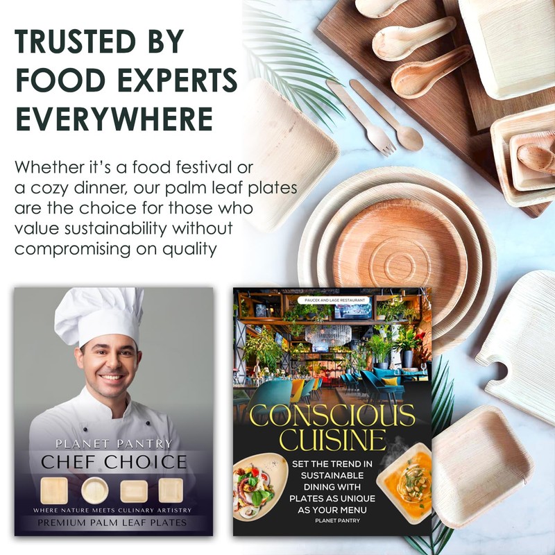 - 🌍 100% NATURAL & SUSTAINABLE: Made from naturally fallen leaves of the Areca Palm tree, our disposable trays and platters are compostable and biodegradable, unlike plastic. Planet Pantry Palm Leaf serving pieces are free from chemicals or added toxins throughout the process; Thoroughly cleaned and pressed at 194 degrees Fahrenheit. they're perfect for eco-conscious events, including big gatherings, buffets, and parties.
