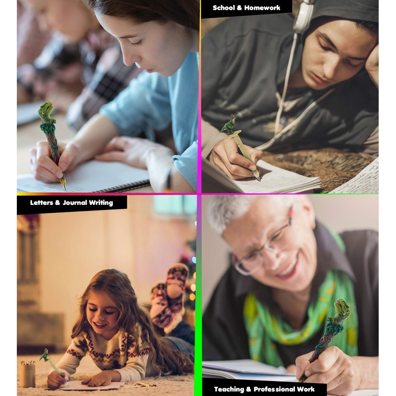 • IDEAL USE FOR THE PREHISTORIC DINOSAURS WRITING PEN BUNDLE - Collectible novelty pens for writing, note-taking, drawing & displaying as unique office & desk decor. Write daily notes with the funky decorative colorful pens for kids, teens & adults that will add fun & uniqueness to your stationery collection & office workspace. These dinosaur art resin decor pens are cute decor or desk accessory for your study table, office desk & working station. Recommended for children 5 years and up.