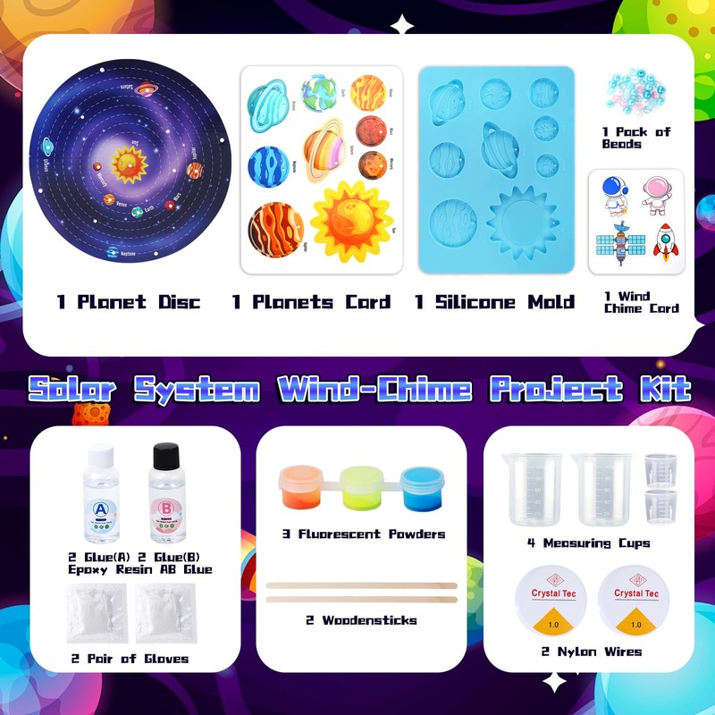 - High Quality & Safety Educational Science Kit: Our solar system project wind chime kit combines education & fun—kids make, assemble, and hang their glowing planets. This kit includes 2 sets of A+B magic resin-solution, silicone planet mold, wind chime base plate, solar system card, glow-in-the-dark powder, 2 rolls of hanging cord, 4 measuring cups, a pack of beads, 2 mixing sticks, and easy-follow instructions—everything needed to create a stunning solar system wind chime!