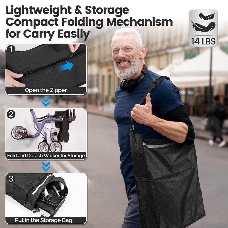 - 【BRAND NEW SUPER LIGHTWEIGHT WALKERS】Crafted from premium aluminum, this rolling walker boasts a remarkably lightweight design at just 14 pounds, significantly lighter than many other rollator models. This exceptional portability makes it effortless to transport. With an impressive weight capacity of up to 300 pounds, it seamlessly combines lightness with strength, facilitating your daily strolls and extended excursions. The walker is equipped with a generously sized backrest, a cushioned seat, and a convenient storage bag—perfect for taking brief respites and alleviating discomfort associated with leg and back strain. EMBRACE EFFORTLESS WALKING!