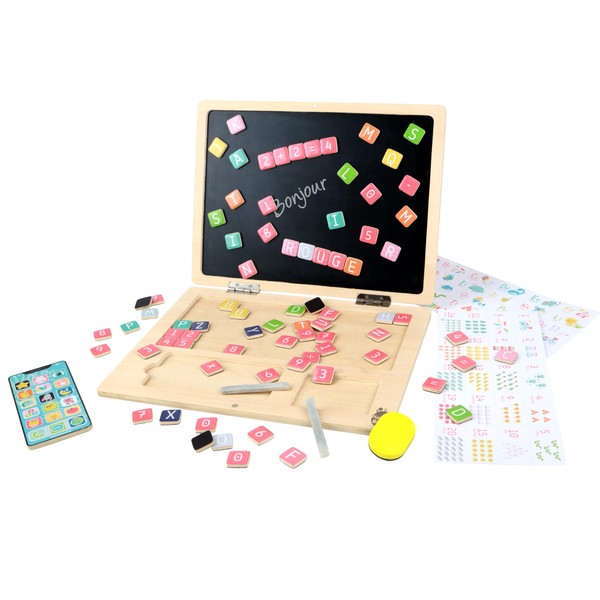 - Contents: This game contains 1 wooden computer with 1 slate board screen, 78 magnetic pieces, 1 smartphone, 1 alphabet and number picture book, 2 chalks and 1 sponge. It is made of wood to provide the necessary stability to last over time.