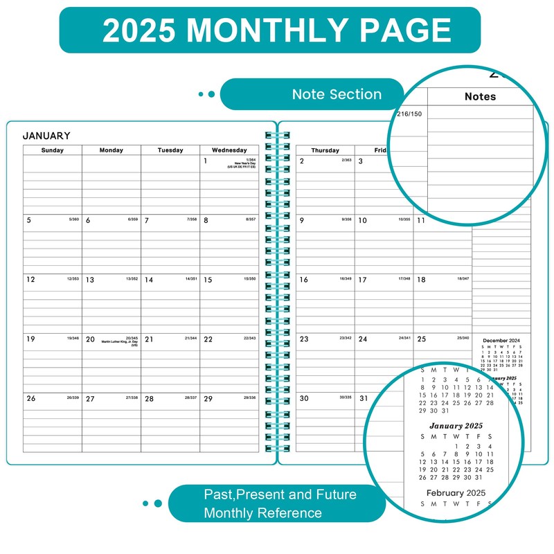 - Monthly Overview - Planner 2025 have equal blocks every month, including Julian dates and USA holidays markings, and notes on the right side of the planner. The 2025 planner have plenty of writing space so that you can record important things this month and write down your plans.