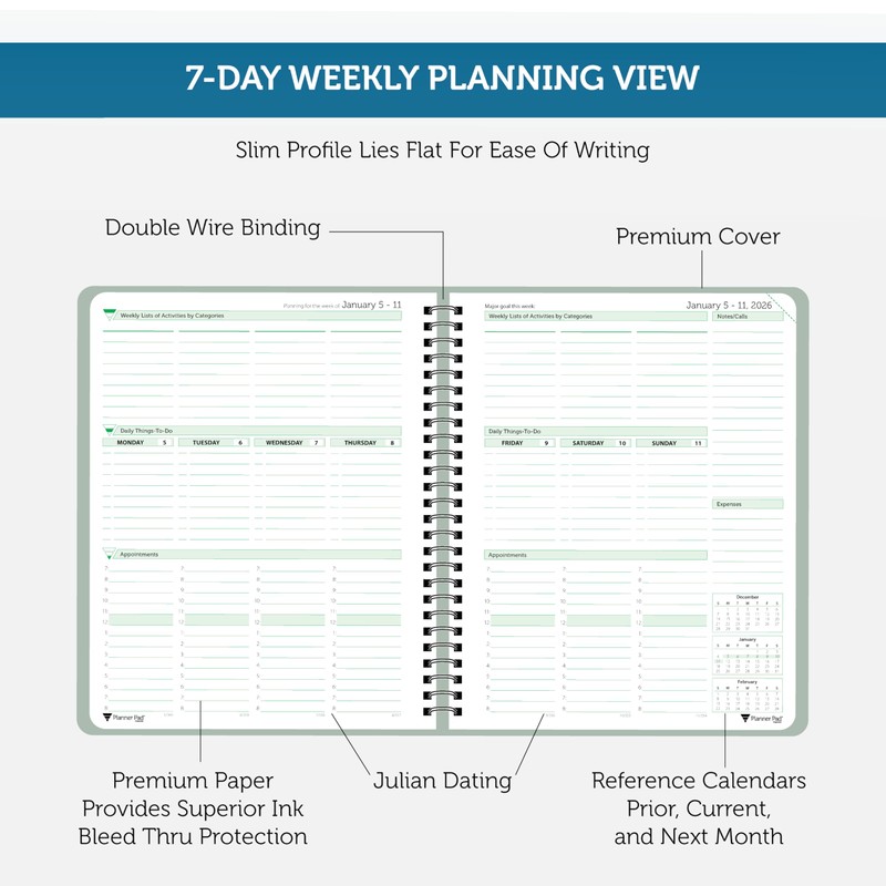 Planner Pad Spiral Bound January-December 2026/ Calender Year 6 3/4" x 8 1/2" Medium 3-Tier Funnel Down 12 Month Organizer, Greenish Grey Cover/Soft Green Ink