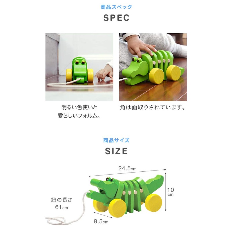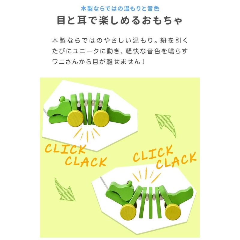 - (Wooden Crocodile with Fun Movement and Sounds) A unique crocodile that makes rattling sound while pulling the string along and rolling around the body. This is a popular toy that has been awarded by many awards