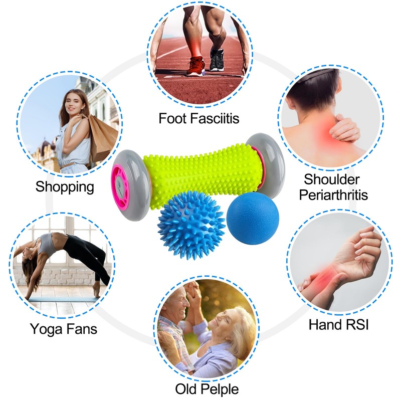 - ★MULTIPURPOSE USE---The plantar fasciitis massager is perfect tool to relieve all sorts of muscle pain, not limit to foot, can use toward legs, hand, wrist, shoulder and neck. Roll away with the massage ball set tension in your neck, shoulders, back, feet and the rest of your body.