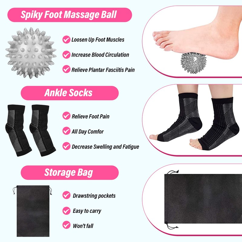 - Reflexology ball and compression stockings: Our foot massage ball helps stimulate blood flow for faster pain relief. Fasciitis compression stockings put pressure on your fascia bands to give you (and your feet) the help you need to relieve discomfort and use this ankle compression sock when you go to the gym, run errands, relax or sleep! Moisture-wicking fabrics keep feet cool and comfortable all day long.