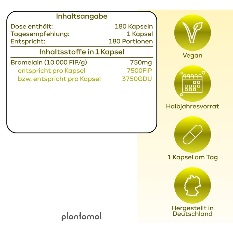 plantomol 180 bromelain capsules with 7500 FIP/capsule - high-dose bromelain - 750 mg bromelain enzyme from pineapple - enzyme activity of 10,000 FIP/g - 6 month supply