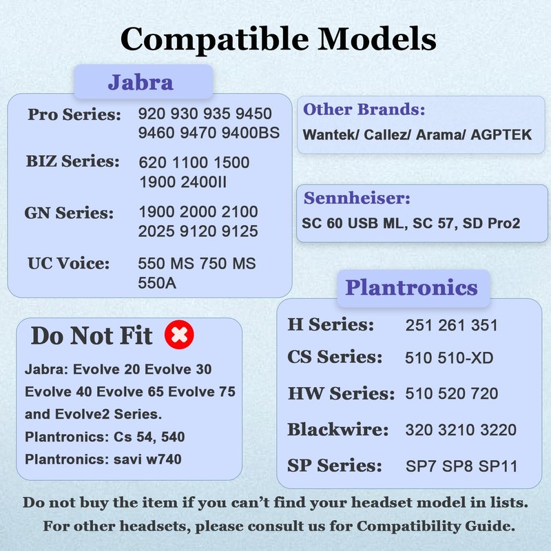 - Compatible Headset Models: NOT for Jabra Evolve 20 30 40 65 75 and Evolve2 Series. ONLY COMPATIBLE WITH SOME SPECIFIC HEADSETS MODELS LISTED IN DESCRIPTION. Some specific models from Plantronics HW251N HW261N HW510 HW520 Blackwire C225 C310 C320 3210 3220 3310 3320 3315 3325 and Jabra PRO 920 930 9450 9460 9465 9470 BIZ 620 1100 1500 1900 2400II GN 1900 2000 2100 2025 9120 9125 and ALL Callez headsets, etc. But For other headsets, please consult us for Compatibility Guide and advice.