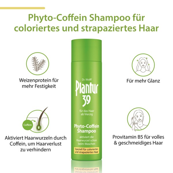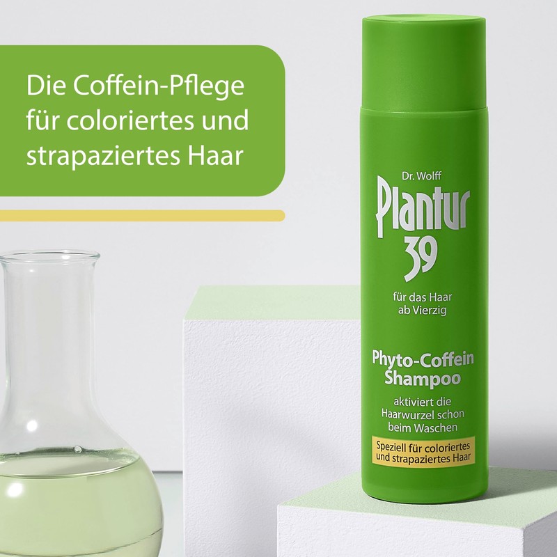 ProduktbeschreibungenPlantur 39 Phyto-Coffein-Shampoo speziell für coloriertes und strapaziertes HaarMit einem hochwertigen Phyto‐Coffein‐Complex menopausalem Haarausfall vorbeugen – mithilfe des Plantur 39 Phyto-Coffein Shampoos ist dies möglich. Ganz unkompliziert, ohne zusätzlichen Aufwand, einfach beim Haarewaschen. Denn der Plantur 39 Phyto-Coffein-Complex dringt bereits bei der Haarwäsche in den Haarfollikel vor. Das Plantur 39-Coffein ist bereits nach 2 Minuten Einwirkzeit an der Haarwurzel nachweisbar und bildet dort ein 24-Stunden Wirkdepot. Der Extrakt von weißem Tee verbessert die Widerstandskraft der Haarwurzeln.Das Shampoo ist mit seiner Pflegeformel mit Weizenprotein und Provitamin B5 gezielt auf die Bedürfnisse von coloriertem und strapaziertem Haar abgestimmt: Poröses, trockenes Haar erhält so mehr Festigkeit, Glanz und Fülle.Auf einen Blick Einzigartiger Phyto-Coffein-Complex Beugt menopausalem Haarausfall vor Beugt dünner werdendem Haar vor Verbesserte Widerstandskraft durch Extrakt von weißem Tee Mit Weizenprotein und Provitamin B5 Für coloriertes und strapaziertes Haar Passende Pflege-Spülung und passendes Elixier erhältlichPlantur 39 Phyto-CoffeinDen Begleiterscheinungen, die die Menopause für das Haar mit sich bringt, können Frauen nun vorbeugen. Denn die Wechseljahre gehen häufig mit einer Erschöpfung der Haarproduktion einher. Plantur 39 Phyto-Coffein sorgt dafür, dass die Menopause nicht zwangsweise von dünner werdendem Haar oder gar Haarausfall begleitet wird. Die Haarwurzeln werden durch den Phyto‐Coffein‐Complex vor hormonbedingter Wachstumsschwäche geschützt. Optimal aufeinander abgestimmte Pflegeprodukte wie Plantur 39 Phyto-Coffein Shampoo und Conditioner sowie das Plantur 39 Phyto-Coffein-Tonikum bilden so die ideale Pflegegrundlage für das Haar ab Vierzig.Gebrauchsanweisung1. Das Shampoo auf nasses Haar auftragen, 2. sanft in die Kopfhaut einmassieren, 3. 2 Minuten einwirken lassen, 4. gründlich ausspülen.WarnhinweiseNur zur externen Verwendung