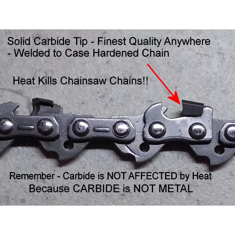 PlasmDyn© - SOLID Carbide Tip Chainsaw Chain 3/8" pitch - 0.050 gauge - 57 Drive Link - Low Vibration Fits MANY 16" Saws includingCraftsman©Echo CS Series, John Deere 25EV, 200CS, Shindaiwa and many other 16" saws using a 3/8" x 0.050" chain Solid Carbide Teeth replacement chain for pole saws using 16" bar - same fit as Oregon© Type 91xx chain, replaces Oregon© S57 Chain - 17" Inch bar - except this chain has a SOLID CARBIDE cutting edge. This chain fits saws using a 3/8" low profile 0.050" gauge and 57 drive link count. |