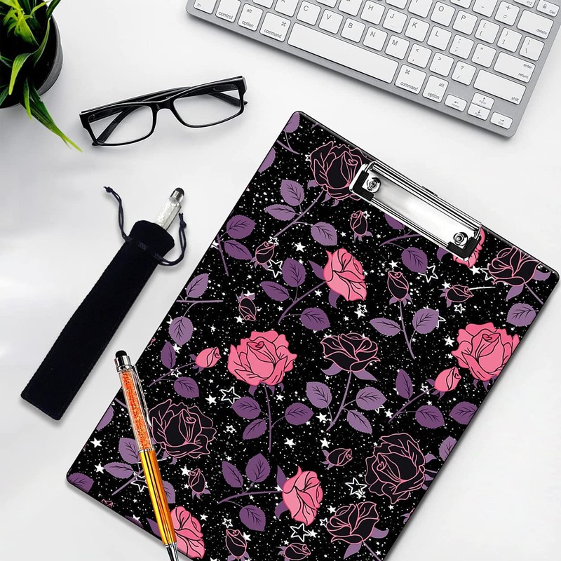 Plastic Clipboard with Cute Coaster and Pen Bag, A4 Size Clipboard with Metal Clip and Retractable Hanging Hole, Suitable for School, Office, Home (Starry Sky and Red Rose)