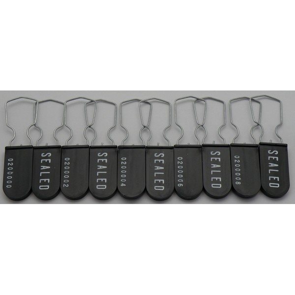Made in the USA with Corrosion resistant galvanized wire and Plastic. Recyclable. Hot stamped “SEALED” with sequential numbering. Body size: .75” X 1.50” X .17”, Wire dimensions: .047”, 18 AWG Breaking strength: 100 lbs. Full length including wire 2.548” when locked.The seals have a hook end that pushes down into lock the seal.These one time use seals can be used for many different applications including, but not limited to:Aircraft liquor carts US & UK Customs Approved, Drums, Hoppers, Medical cabinets, Switches, Valves, Utility meters, Electric meters, Storage containers, Storage units, Semi trailers, Breakers, and many other uses.
