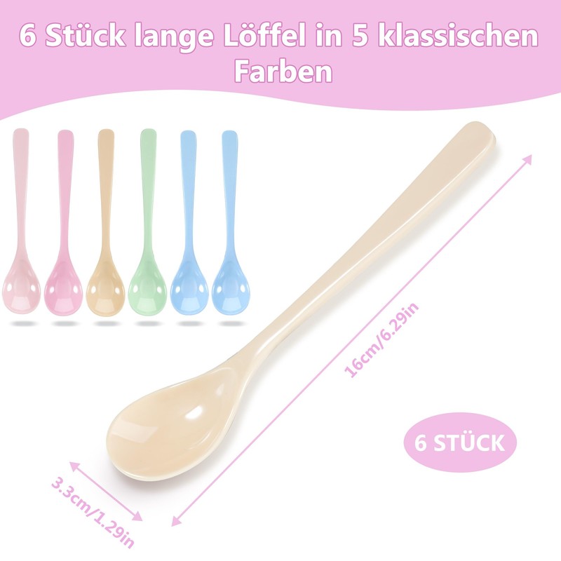 Plastic Spoons, Pack of 6 Colour Plastic Spoons, Long Egg Spoons, Plastic Spoons, Reusable Soup Spoons, Jam Spoons, Anti-Drops, Long Handle Spoon for Coffee, Drinks, Eggs, Ice Cream, Yoghurt (16 cm)