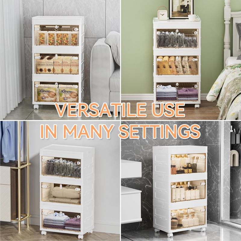 - Movable & Stackable: Foldable storage box each layer come with beside buckles which can be stacked easily, the top cover of the storage cabinet can also hold daily supplies(only one lid). Movable cabinets equipped with four rotatable wheels(two lockable), increasing the convenience of mobility, make household cleaning easier