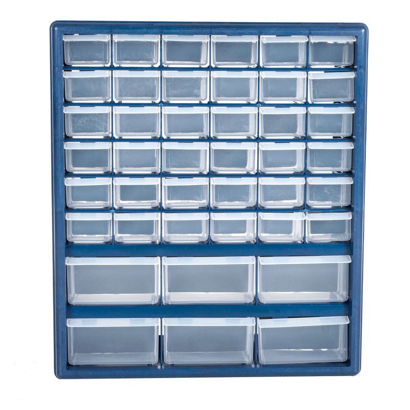 - MULTI-PURPOSE – With 42 bins (6 large, 36 small), this cabinet is ideal for storing and organizing everything from fishing tackle, small business supplies, hardware like nuts, screws, and bolts, to crafting materials, beads, makeup, or jewelry.