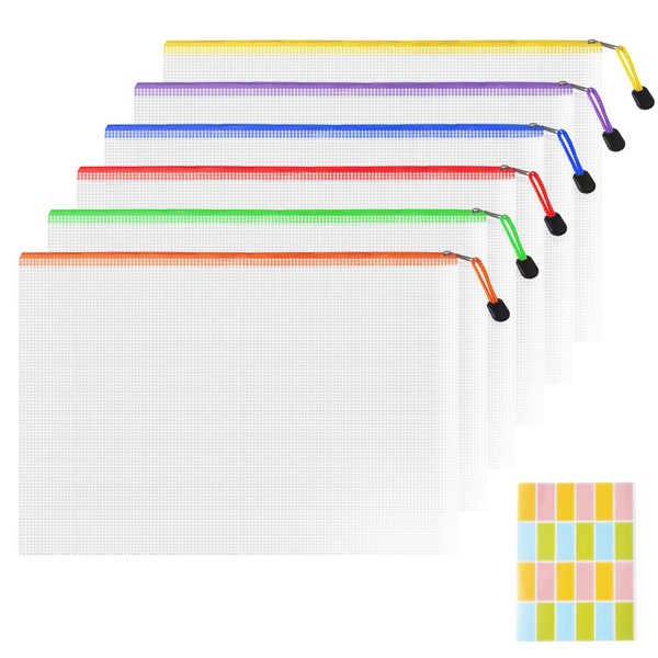 Plastic Wallets A4 Zip Folders - 6PCS Waterproof Zip Lock Bags Document Wallet Zipper File Bag Mesh Zipped Pouch Bags for School, Office, Home and Travel (6 Colors)