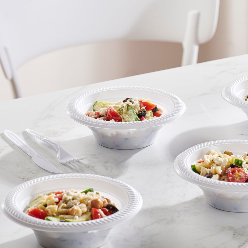 - White plastic cuisine bowls are versatile and perfect for everyday use and also a great choice for your party. Mix and match with other colors or use with all white dishes for sharp and sophisticated party décor.