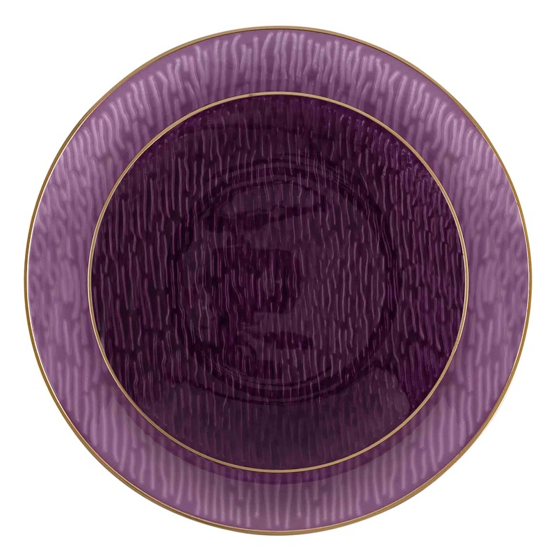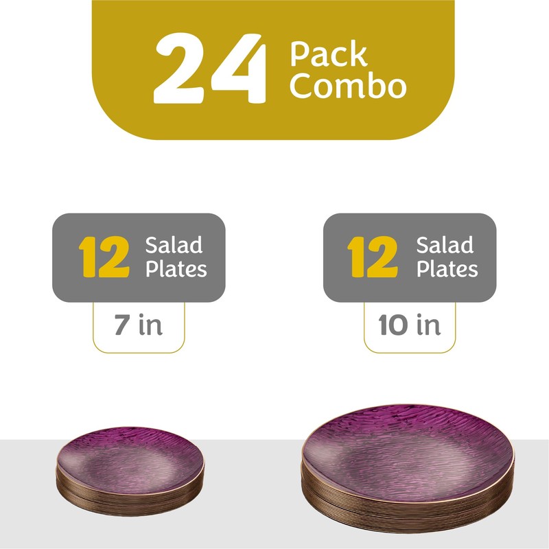 - 24 Pack Purple with gold rim disposable dishes. Each combo set includes 12 7 inch and 12 10 inch plastic dinner plates.