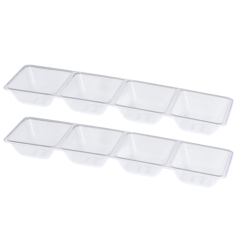 - SIZE 5'' X 16'' Rectangle Clear serving plate / Platter / Tray consists of 4 divided sections which is excellent for serving snacks and appetizers, Dips, each section are amply sized for chips and salsa, veggies and dip, shrimp and cocktail sauce and much more