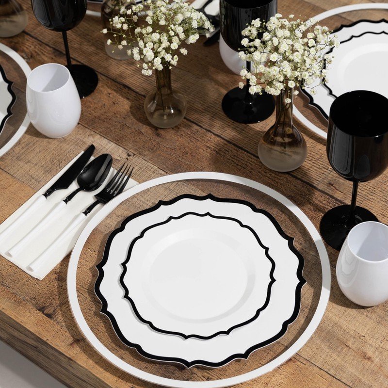 PLASTICPRO 64 Pack Elegant Disposable Plastic Plates Combo Set Includes 32 Dinner Plates and 32 Salad Plates Heavy Duty Fancy Party Plates White & Black Contemporary Design