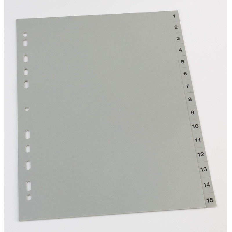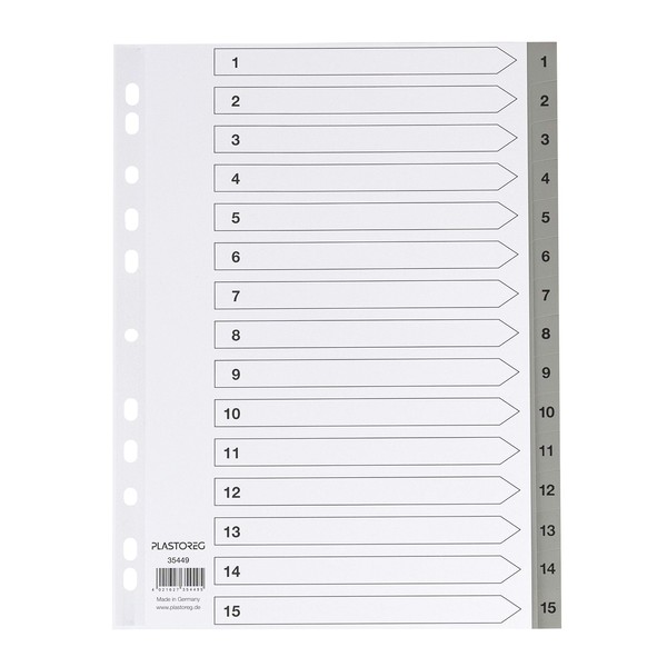 Das 15-teilige Register aus PP-Folie hat eine Folienstärke von 0,12 mm. Die Taben sind mit Prägung von 1-15.