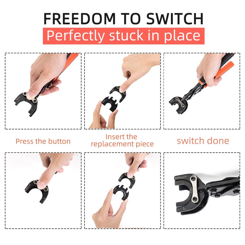• INTERCHANGEBLE ADAPTERS: The adapter is easy to install or replace - push on the lever labeled "PUSH", follow the direction labeled "PIPE" and "FITTING" on tool and plates to slide the old plate out and slide the new plate in.