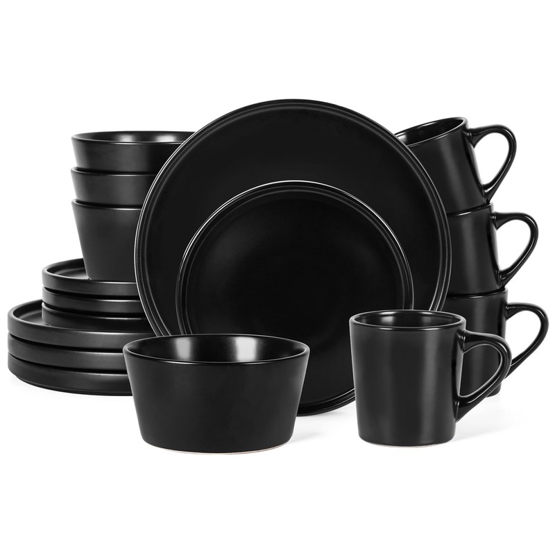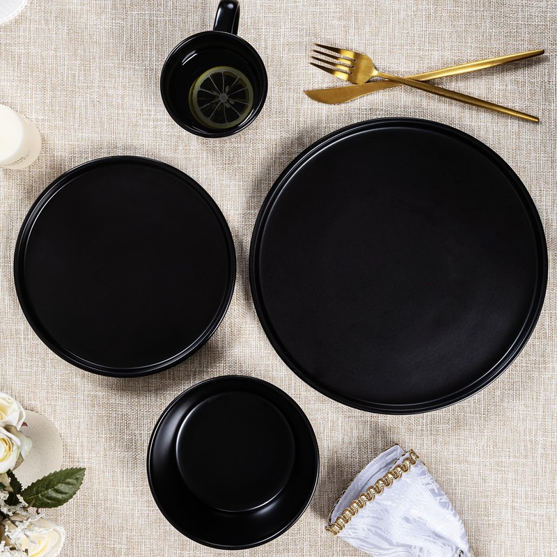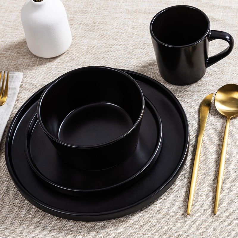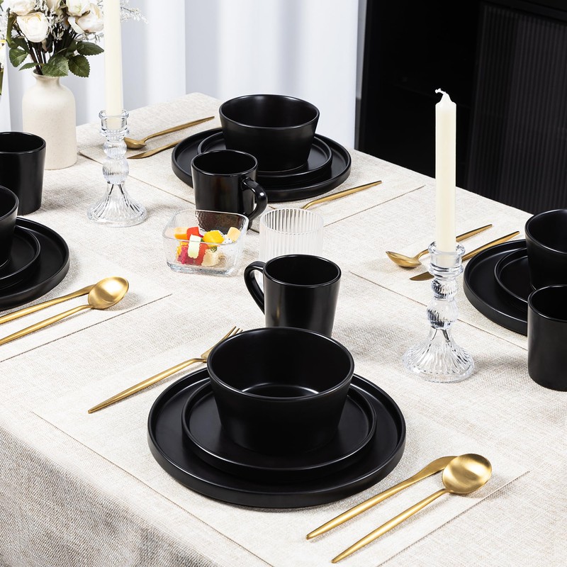 Plates and Bowls Sets for 4 - CJDC-QUELO 16 Piece Stoneware Dinnerware Sets with Mugs, Ceramic Dishware Sets for Kitchen Dining Use, Chip and Scratch Resistant Microwave Dishwasher Safe, Black