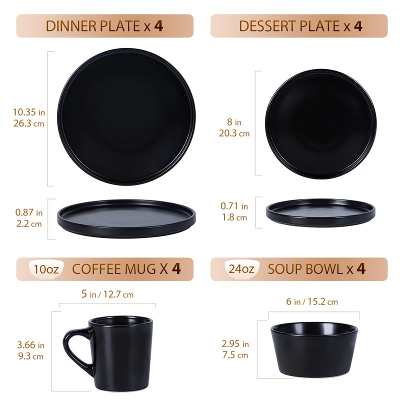 - 16-Piece Complete Set: Includes 4 dinner plates(10.25"), 4 dessert plates(8"), 4 salad/cereal bowls( 6"), 4 coffee mugs(12oz). This set has everything you need for a full table service of 4. Dishwasher and microwave safe, effortless cleanup and reheating, designed for modern convenience.