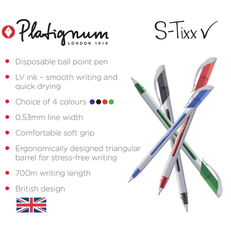 Platignum S-Tixx Black Ballpoint Pen [Pack of 12] Soft Grip Barrel with LV Ink for Smudge-Free and Ultra-Smooth Writing [50513]
