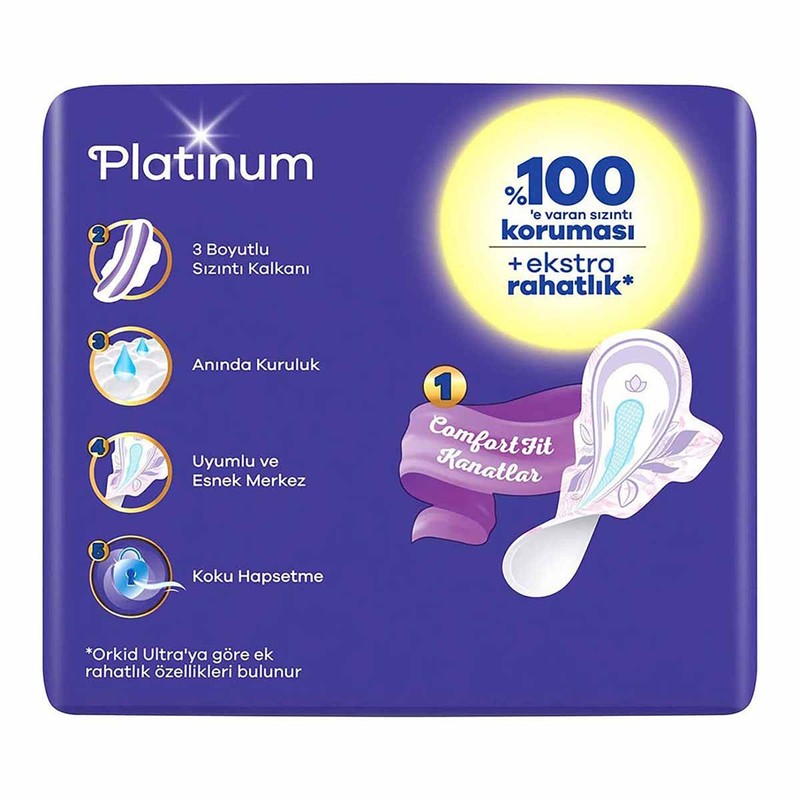 Orkid Platinum Ultra Gece (Boy 3) hijyenik pedler, (Orkid Ultra’ya göre) daha geliştirilmiş koruma ve konfor sağlar. Kenar bariyeri görevi gören 1000 mikro yastık ve geliştirilmiş iç kısım ile Orkid Platinum, Orkid Ultra Ekstra’ya göre daha iyi koruma ve yumuşaklık sağlar. Ayrıca, kokuları sadece gizlemeyen, onları etkisiz kılan Kokuyu Hapseden Teknoloji de bulunur. Orkid Platinum sadece 3 mm inceliğinde olsa da, adet döneminiz boyunca harika bir rahatlık hissi ve koruma sunar. Ödün vermeniz gerekmiyor. Orkid Platinum ile Orkid’in en iyi koruma ve konfor bileşimini elde edersiniz. Orkid Platinum'un gece korumaya yönelik en iyi hijyenik pedi olan Orkid Platinum Ultra Gece Ekstra'yı (Boy 4) deneyin. Daha iyi koruma, daha iyi yumuşaklık (Orkid Ultra Ekstra’ya göre) Pamuksu yumuşak mikro yastıklar ile daha fazla yumuşaklık (Orkid Ultra Ekstra’ya göre) Son derece emici kenar bariyerleri ile daha iyi koruma (Orkid Ultra Ekstra’ya göre) Daha emici materyal içeren geliştirilmiş daha güçlü iç kısım (Orkid Ultra Ekstra’ya göre) Güçlü koku hapsetme özelliği Dermatolojik olarak test edilmiştir Orkid Platinum Ultra Gece (Boy 3) hijyenik pedler, (Orkid Ultra’ya göre) daha geliştirilmiş koruma ve konfor sağlar. Kenar bariyeri görevi gören 1000 mikro yastık ve geliştirilmiş iç kısım ile Orkid Platinum, Orkid Ultra Ekstra’ya göre daha iyi koruma ve yumuşaklık sağlar. Ayrıca, kokuları sadece gizlemeyen, onları etkisiz kılan Kokuyu Hapseden Teknoloji de bulunur. Orkid Platinum sadece 3 mm inceliğinde olsa da, adet döneminiz boyunca harika bir rahatlık hissi ve koruma sunar. Ödün vermeniz gerekmiyor. Orkid Platinum ile Orkid’in en iyi koruma ve konfor bileşimini elde edersiniz. Orkid Platinum'un gece korumaya yönelik en iyi hijyenik pedi olan Orkid Platinum Ultra Gece Ekstra'yı (Boy 4) deneyin. Daha iyi koruma, daha iyi yumuşaklık (Orkid Ultra Ekstra’ya göre) Pamuksu yumuşak mikro yastıklar ile daha fazla yumuşaklık (Orkid Ultra Ekstra’ya göre) Son derece emici kenar bariyerleri ile daha iyi koruma (Orkid Ultra Ekstra’ya göre) Daha emici materyal içeren geliştirilmiş daha güçlü iç kısım (Orkid Ultra Ekstra’ya göre) Güçlü koku hapsetme özelliği Dermatolojik olarak test edilmiştir"Mesafeli Satış Sözleşmemiz uyarınca; toptan veya yeniden satış amaçlı oluşturulduğu tespit edilen siparişler ile ürün, hizmet ve indirimlerimizden tüm müşterilerimizin faydalanabilmesi ve stokçuluğun engellenmesi için 6 adetin üzerindeki doğrudan ve dolaylı siparişleri Eve’in iptal hakkı saklıdır."