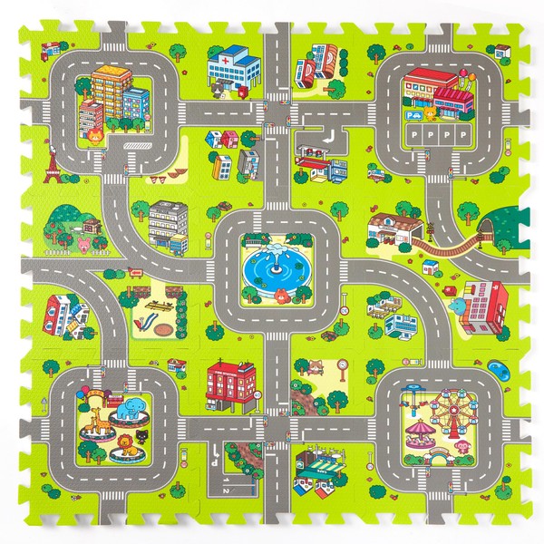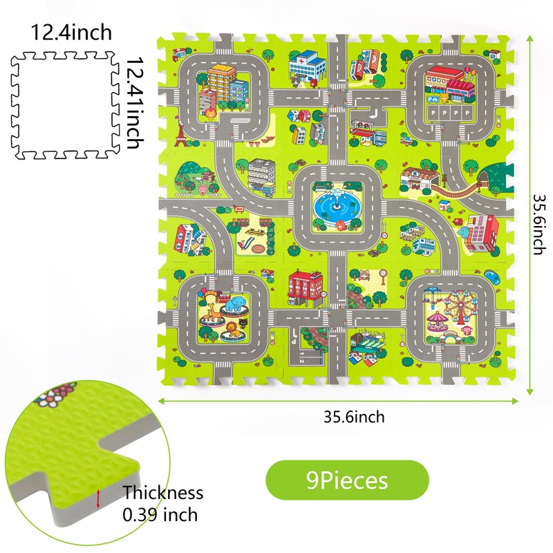 - Fun and Interlocking Foam Mats-This children’s play mat has 9 pieces with tile size 12.4 by 12.4 inch. This City Rug includes Hospital, School, Zoo, Parking and so much more! This play mat is a versatile choice for creating a fun and safe play area for your little angel.