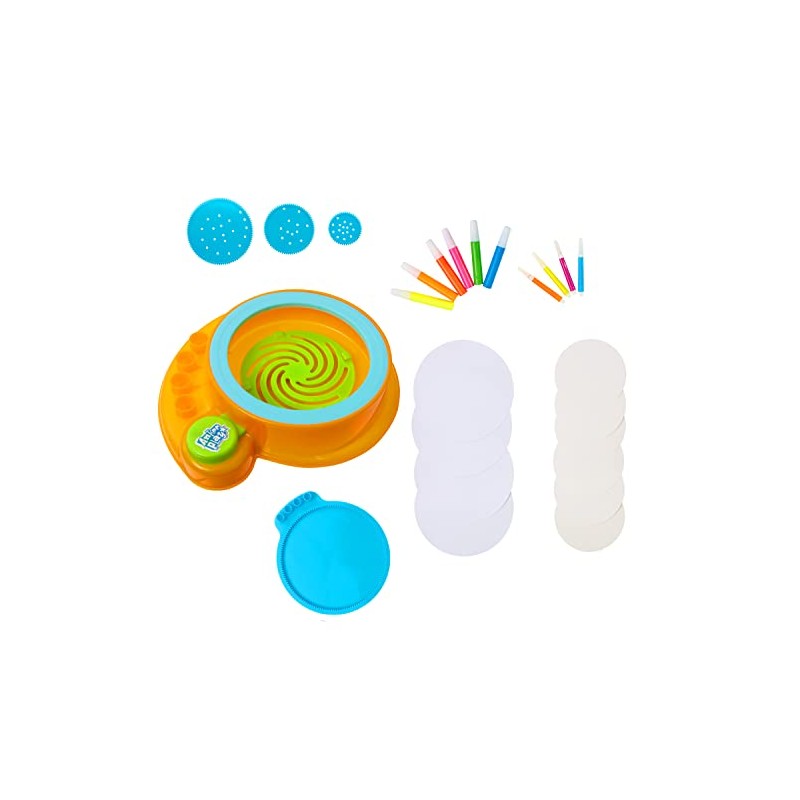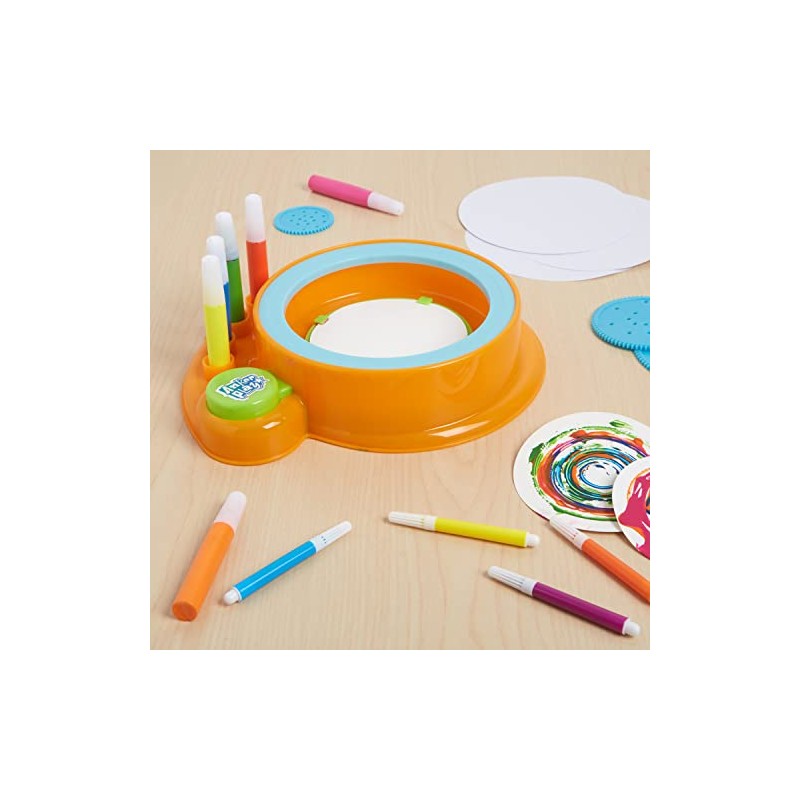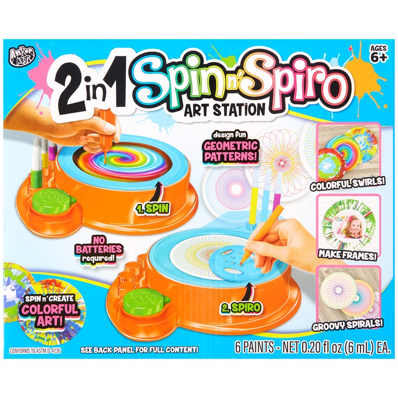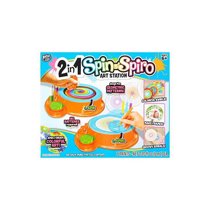 • SAFE, EASY, FAMILY FUN - This 2 in 1 Art Station includes everything you need to create fun Spin Art works with paint and Spiro Art designs with markers. No batteries required. Simply press the button to spin. Ages 6+.